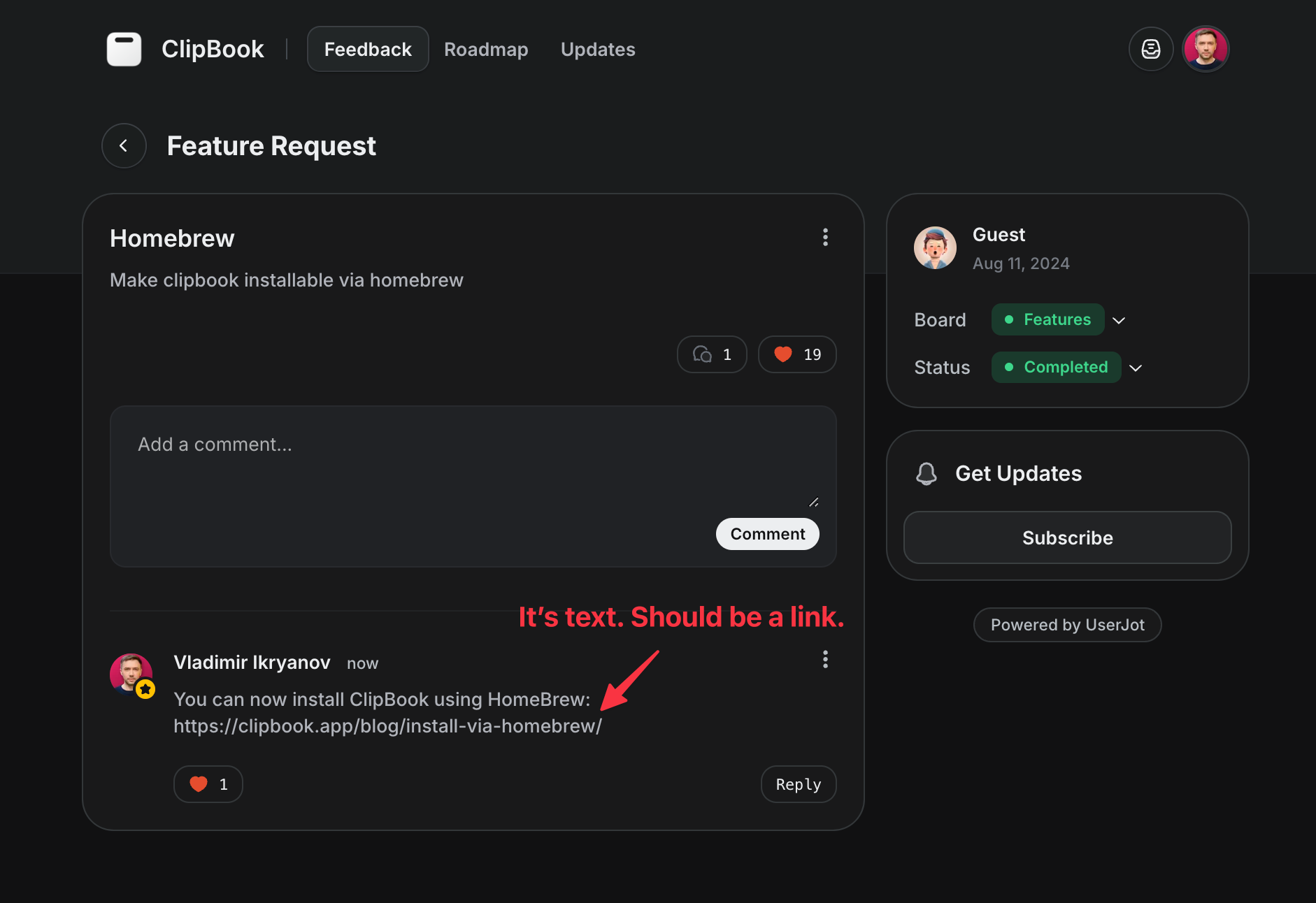 When I put a link in the comment, it's shown as text. I cannot click it to navigate. It would be good to show links as links.